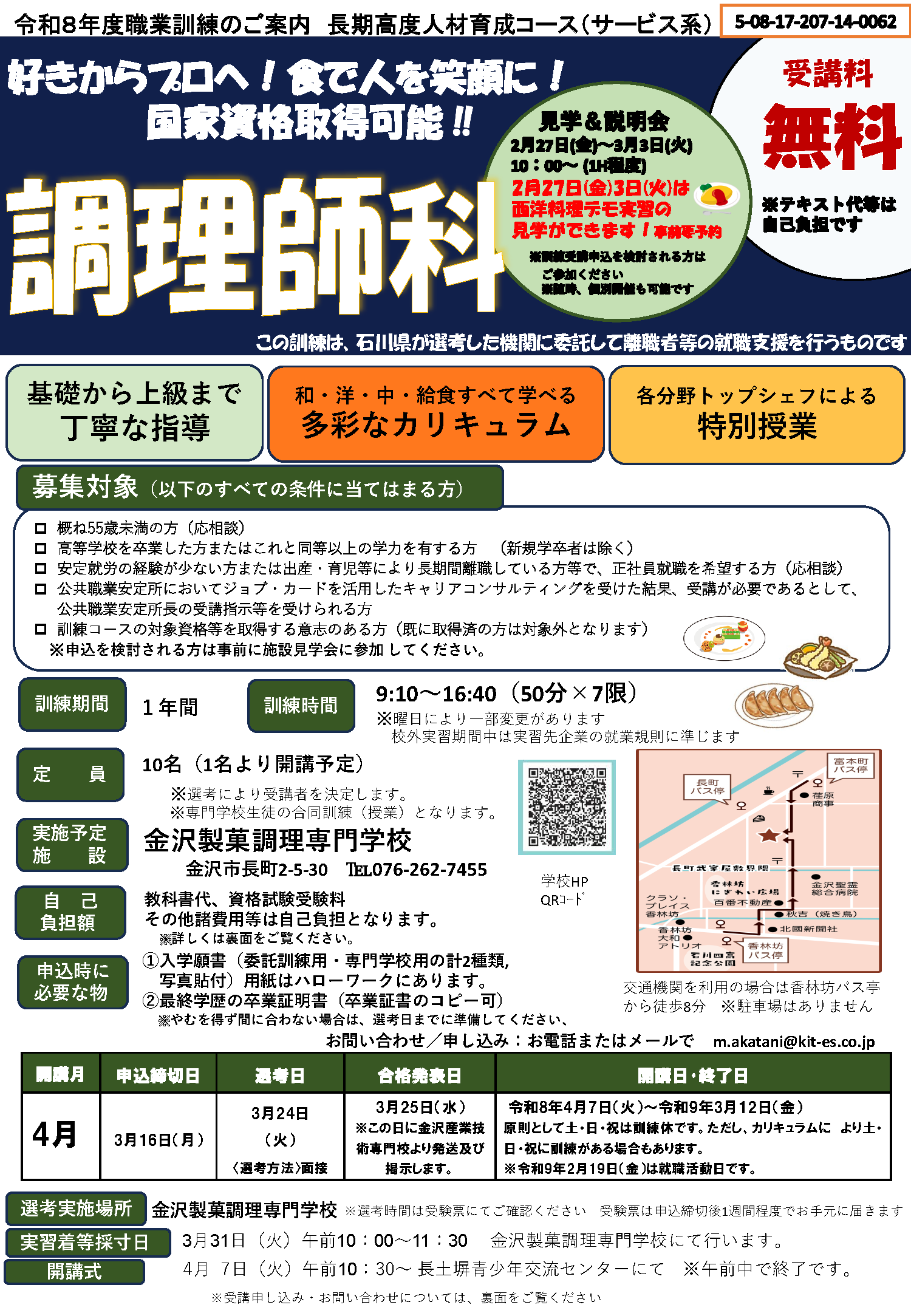 この訓練は、現在離職中、または就職活動している⽅、アルバイト等の⽅が対象です。国の補助により授業料が免除されます。
